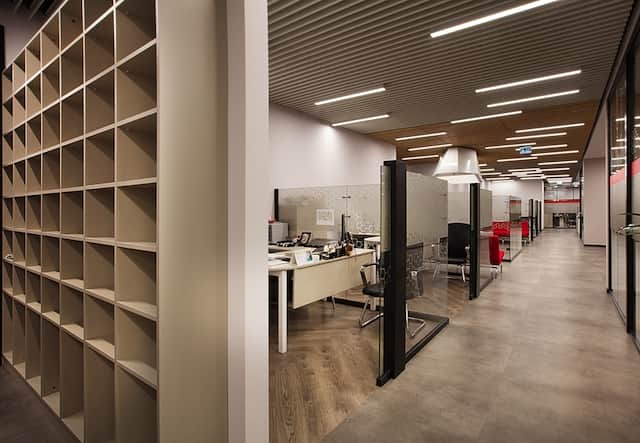 Boytorun Architects, Maslak Building Office binasında iki kata yayılan ve 1500 m2’lik alana sahip Recordati Ofisi’inde genel kurgunun merkezinde çekirdek, WC, IT gibi birimleri, cephede ise ofis alanlarını konumlandırmış. Yönetici odaları ve toplantı odalarında şeffaf bölücülerin kullanılmasının yanı sıra ofis düzeneğindeki çalışma alanlarıyla birlikte açık çalışma alanlarına da yer verilmesi ile Recordati Ofisi’ne ferahlık kazandırılmış. Modern ve esnek bir tasarıma sahip olan projede yer yer firmanın kurumsal renginin kullanılmasıyla etkileyici spotlar oluşturulmuş.