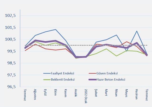 THBB, her ay merakla beklenen Hazır Beton Endeksi’nin 2022 Temmuz Ayı Raporu’nu açıkladı. Rapora göre, haziran ayında yükselen Faaliyet Endeksi, eşiğin üstünde tutunamayarak temmuz ayında düşüş göstermiştir. Yılın başından itibaren düşük görünen Beklenti Endeksi temmuz ayında da yükselmemiştir. Güven Endeksi de temmuz ayında azalarak kritik düzeyin altına gerilemiş durumdadır. Birleşik Beton Endeksi, her 3 endeksteki azalma neticesinde aşağı yönlü hareket göstermiştir.