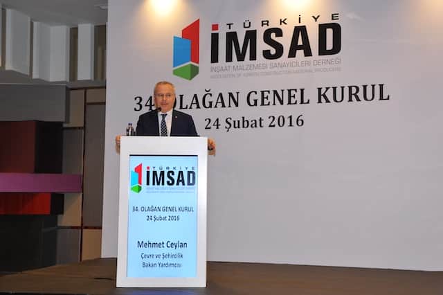Çevre ve Şehircilik Bakanlığı olarak yaşanılabilir bir çevre ve marka şehirler oluşmasında en önemli hedefin yapı ve yapılaşmaya ilişkin bütüncül çözümler getirmek olduğuna dikkat çeken Bakan Yardımcısı Mehmet Ceylan, Türkiye İMSAD’ın çağrısına “Her türlü desteğe hazırız” yanıtını verdi. Türkiye İMSAD’ı inşaat malzemesi sektörüne yönelik yaptığı bilimsel çalışmalar, ekonomi raporları, endeksler ve akademik çalışmalarından dolayı tebrik eden Ceylan, inşaat malzemeleri sektöründe son 13 yıldaki büyüme ve diğer uluslararası gelişmelerin gurur verici olduğuna değindi. Ceylan “Ulusal Bina Yönetmeliği Platformu’nda Türkiye İMSAD’ın yanında olmaktan mutluluk duyarız. Sektör varsa biz de varız, etle tırnak gibiyiz. Bakanlık olarak da bu tür çalışmalara katkıda bulunmak zorundayız. Ülkemizde inşaat sektörü katma değer ve istihdam açısından lokomotif sektördür. Yüzlerce alt sektörü etkilemektedir. Yatırımların yaklaşık yüzde 50’si inşaat sektörüne yapılmaktadır. 2000’li yıllardan itibaren önemli gelişmeler kaydeden inşaat sektörünün öneminin bilincindeyiz” dedi.